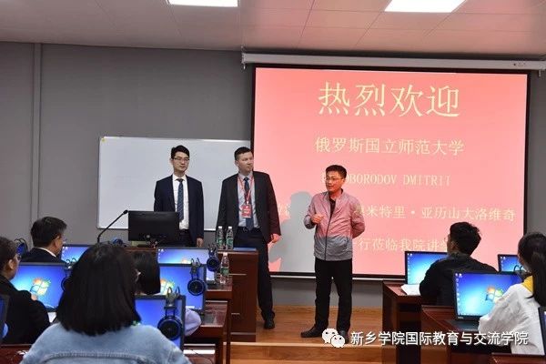 25日下午,在A07-603语音室,别拉博罗多夫·德米特里·亚历山大罗维奇一行与外国语学院俄语专业学生就如何学习俄语、俄语发音等问题进行了双语座谈,外国语学院院长刘守平、副院长李艳叶及俄语教研室全体教师参加了座谈会。