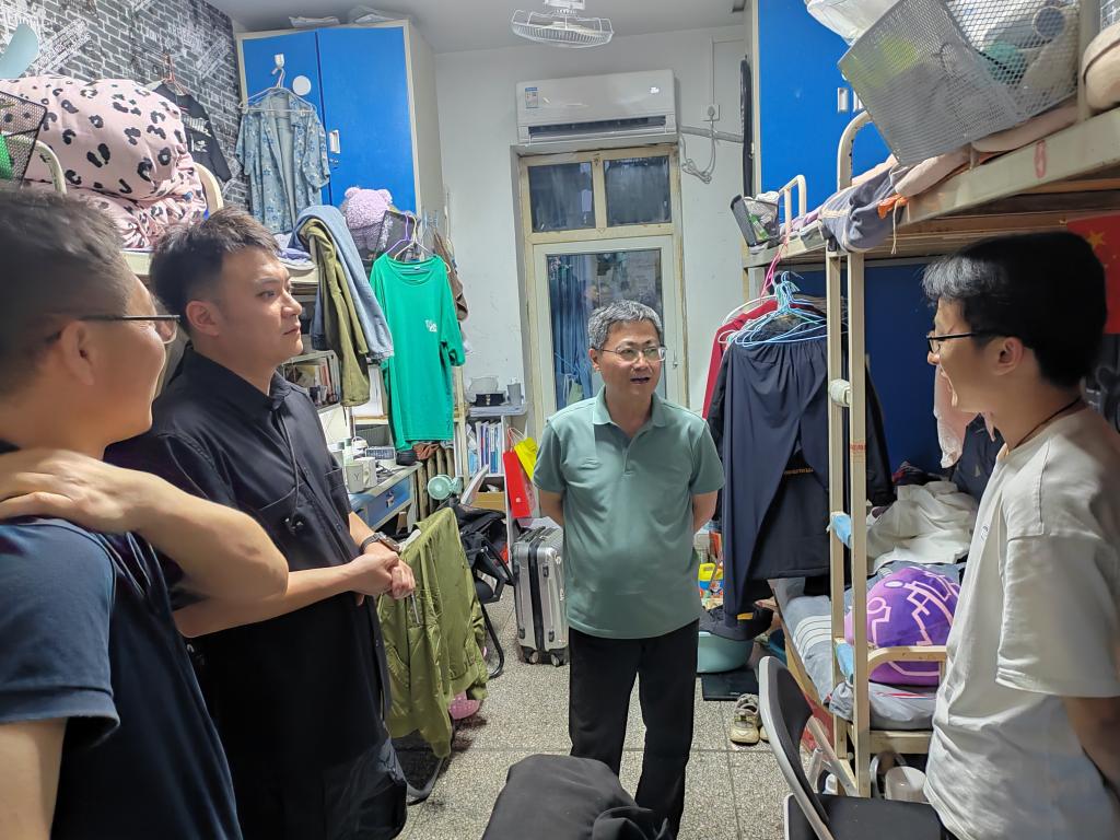 在深入21级学生宿舍时,就学生学业问题,包括学习方式,课业压力,考研升学,四六级情况,与同学们进行了交流探讨,给予了在课程选择、考研备考上的经验建议。